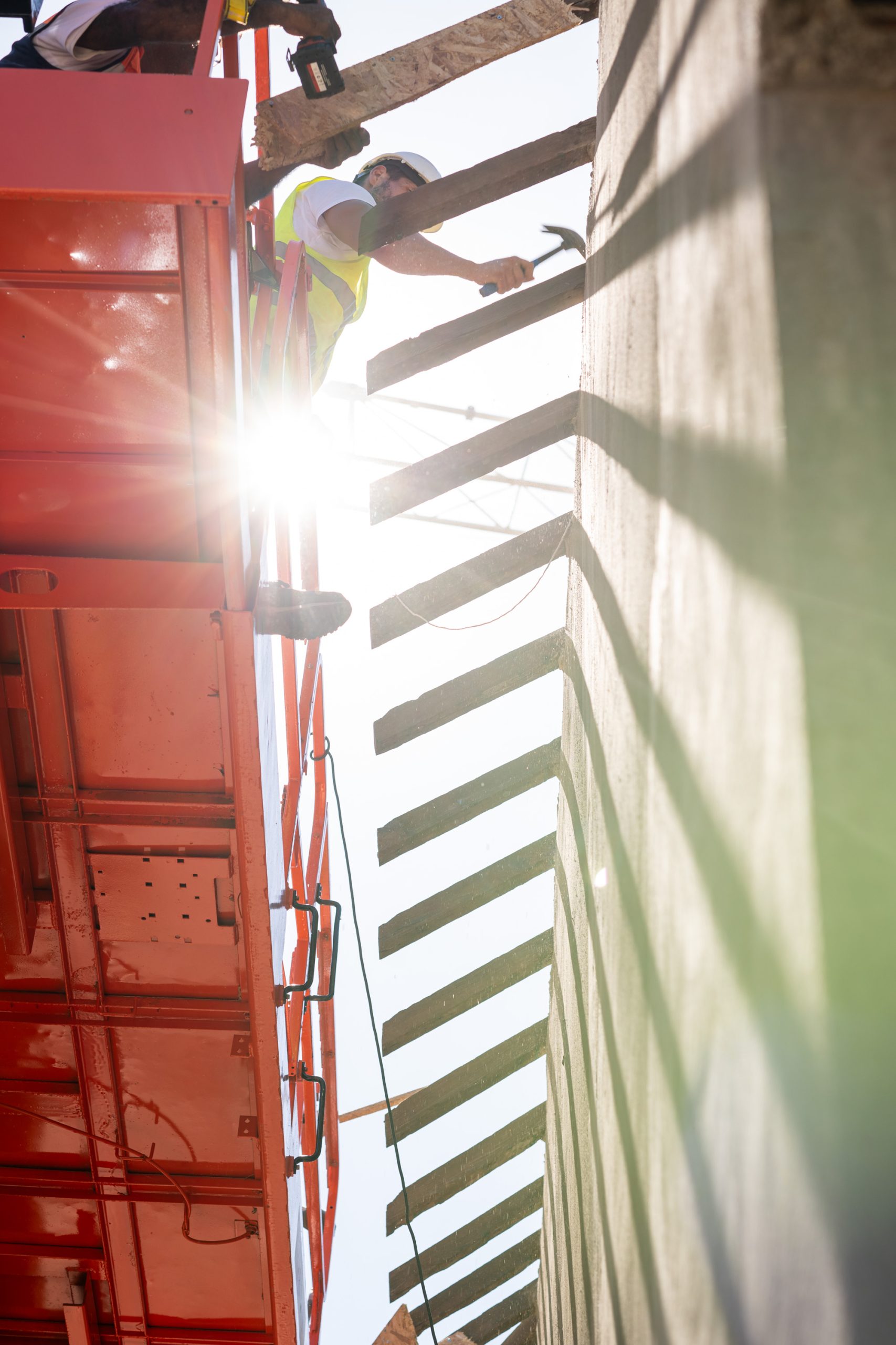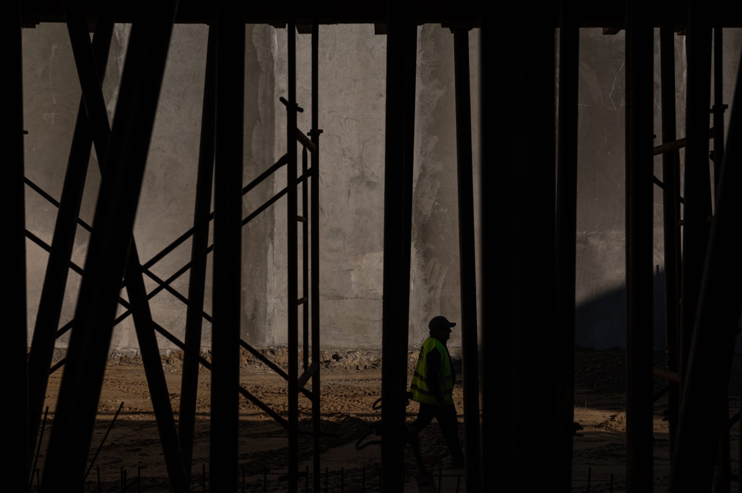 Trabalhador a misturar cimento sob luz intensa no estaleiro do Matadouro do Porto